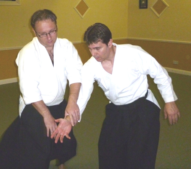 As much of Aikido is based on joint locks you should feel some slight discomfort as the hold or lock is applied, but care must be taken because they are capable of causing serious injury, having been developed from Ju-Jitsu and other martial arts. If at any moment the pain gets too much for you, slap your thigh with your hand and your training partner will slacken the hold. If you are on the floor, slap the mat.