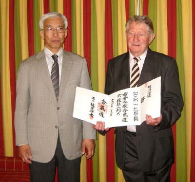Sensei Foster receives his 6th Dan Honbu Certificate from the Doshu.